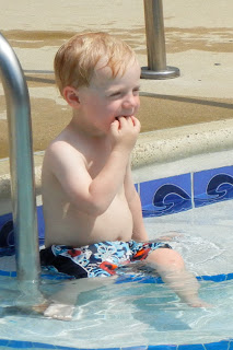This is a very big step for Joey. He really didn't want to sit on the second step, but we convinced him it would be fun. The whole pool was actually only a foot deep, but he just hung on for dear life. So that by the time we were leaving he would walk across while holding my hand was a huge deal.